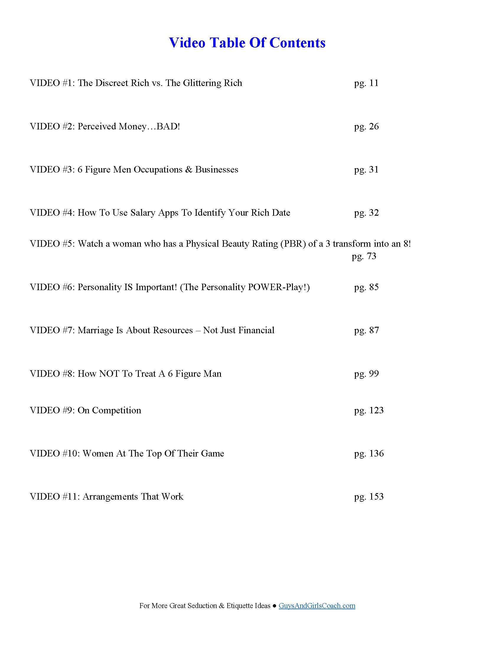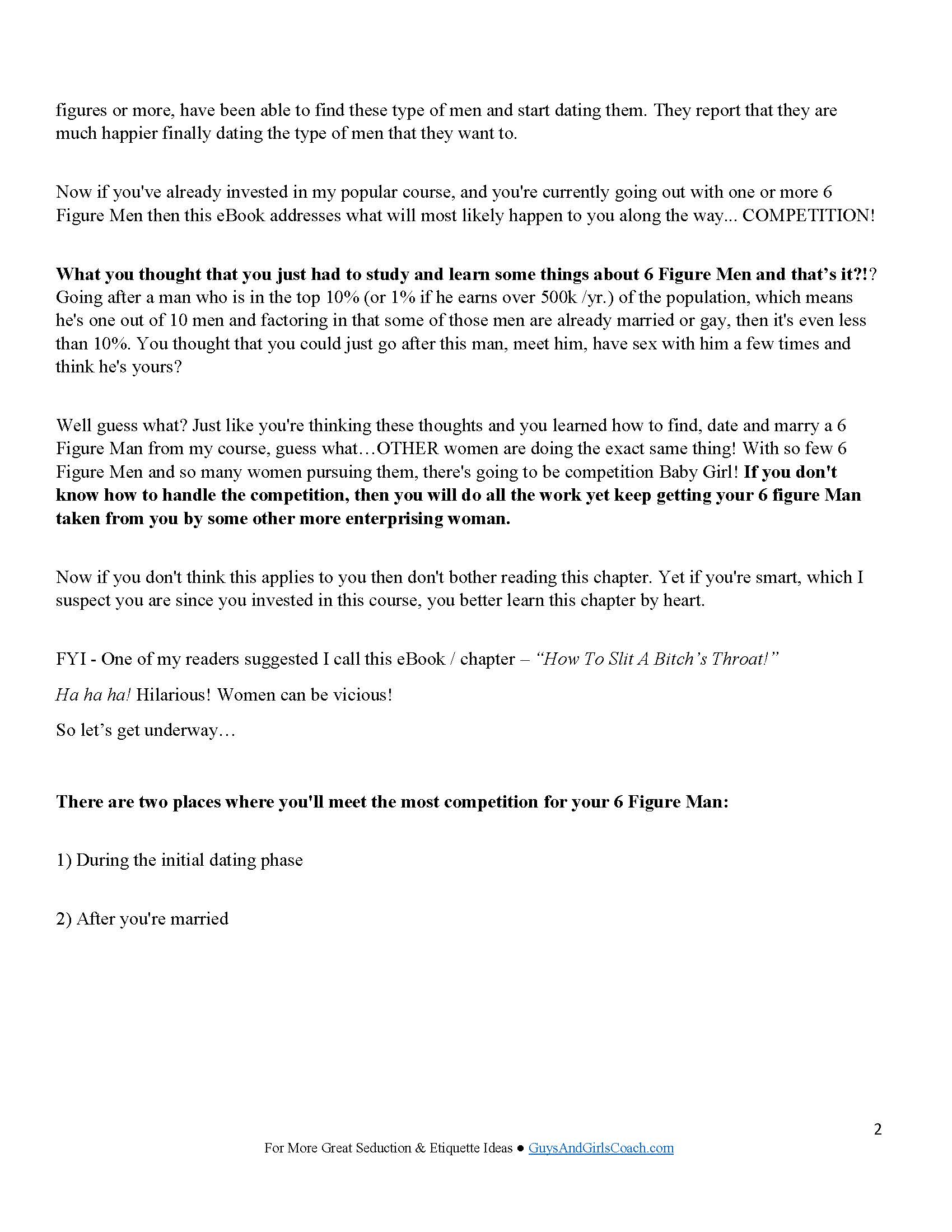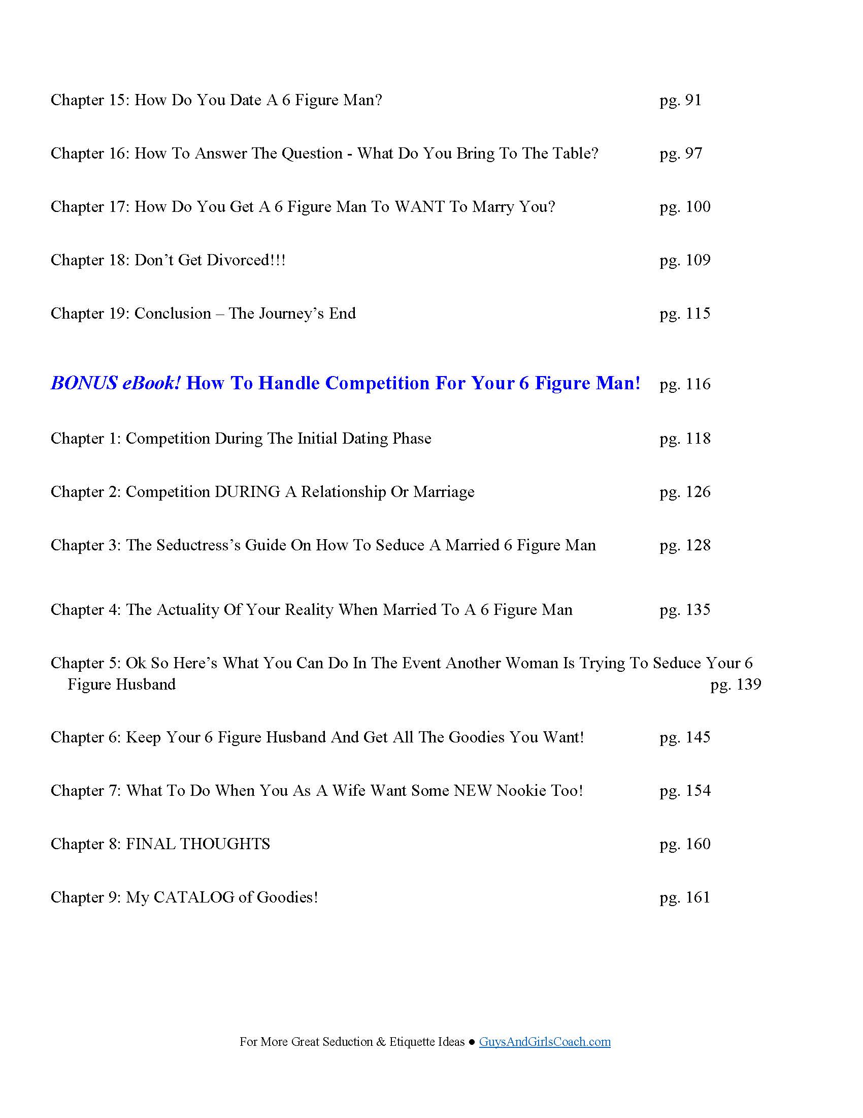 Topics include: Competition During The Initial Dating Phase; Competition During A Relationship Or Marriage; The Actuality Of Your Reality When Married To A 6 Figure Man; Ok So Here’s What You Can Do In The Event Another Woman Is Trying To Seduce Your 6 Figure Husband; Keep Your 6 Figure Husband And Get All The Goodies You Want!; and much more!